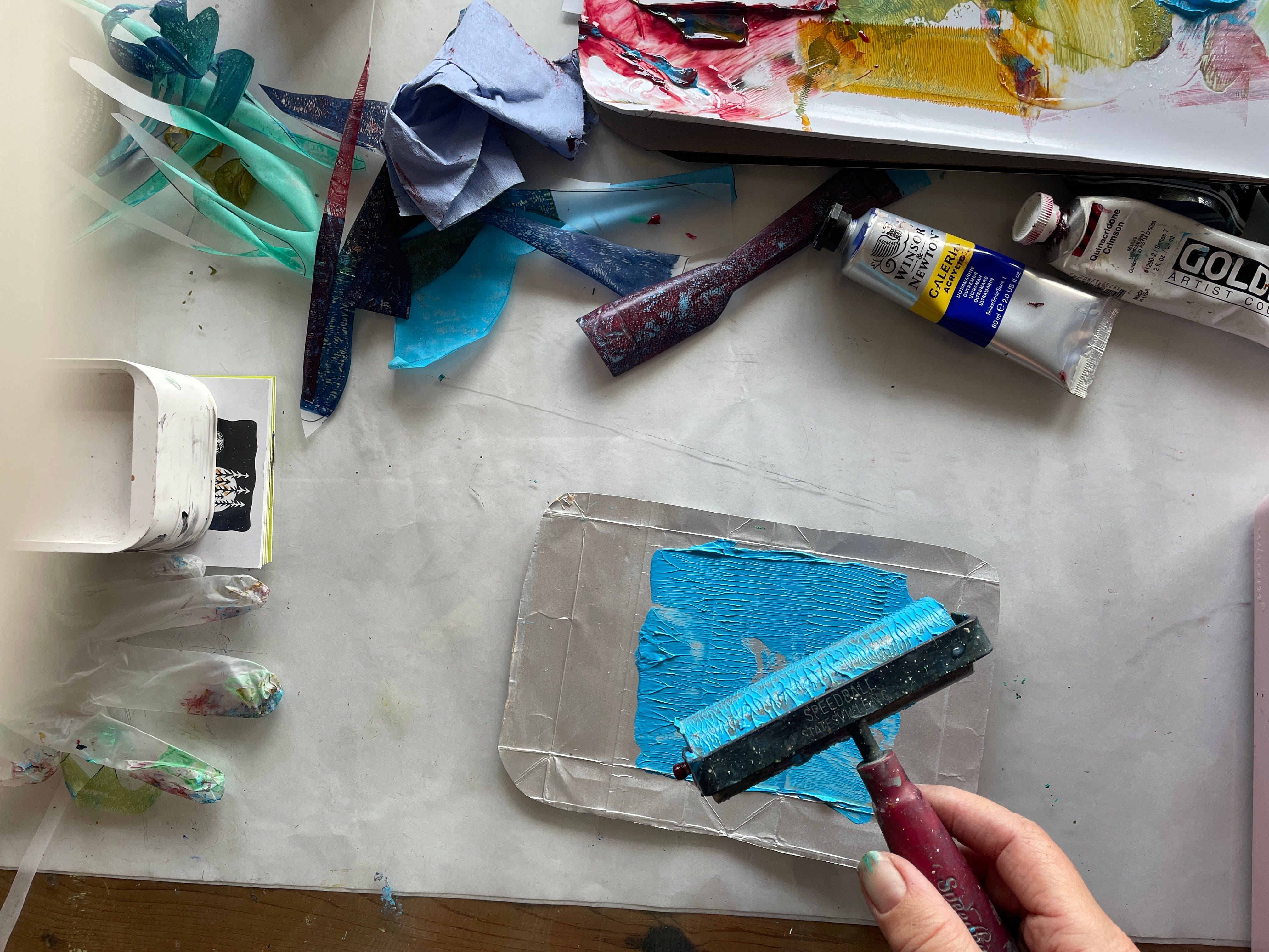 Start with setting up your glass “plate”. Have your roller, paints/inks, tools and kitchen roll to hand.