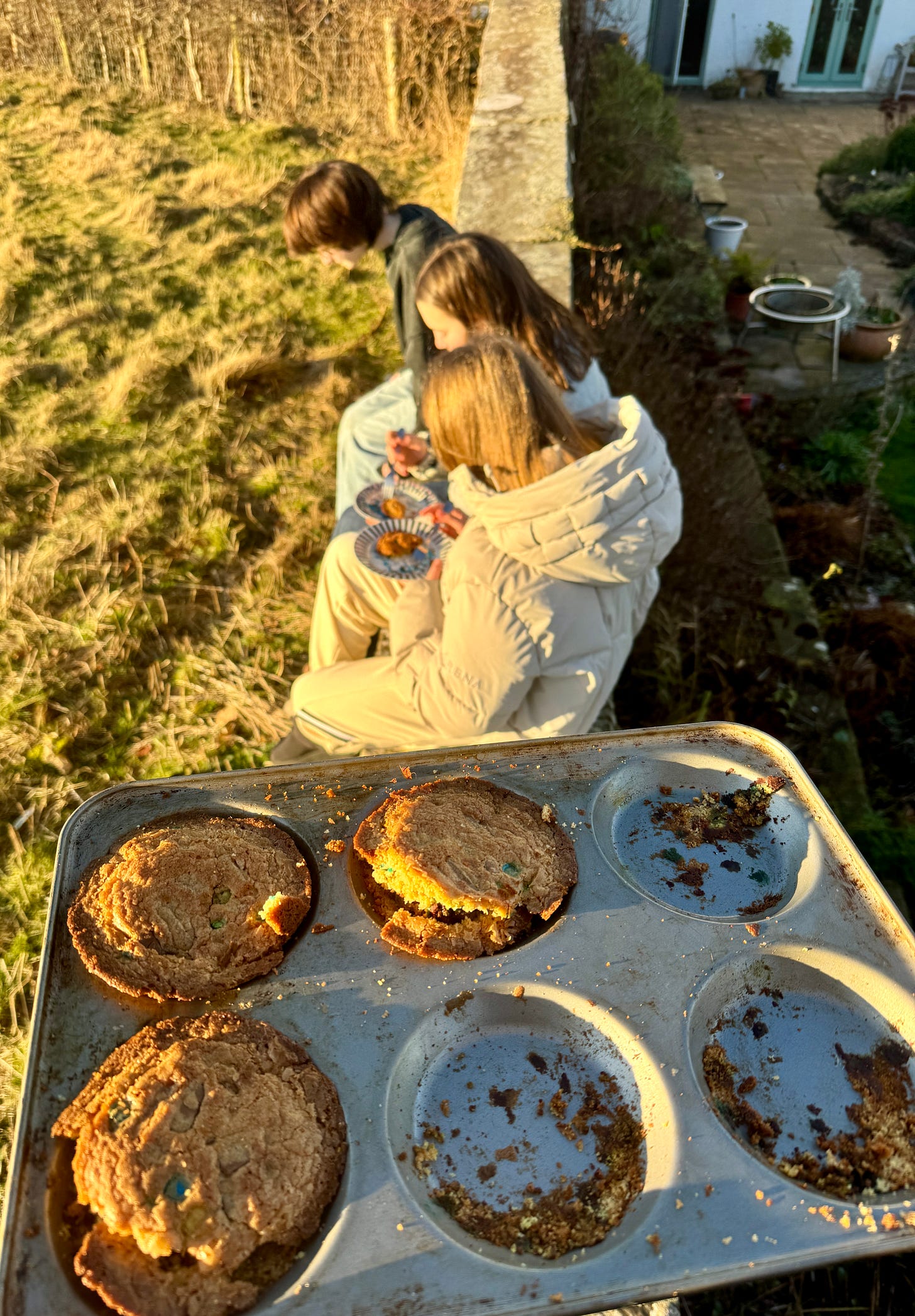 Then I got them baking big colourful cookies and they sat in a row on our long, wide garden wall – faces to the winter sun, munching. I felt involved and tender towards these kids. I wanted them to flourish creatively and socially. And get off screens, which are such convenient babysitters for my parenting cohort.